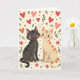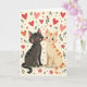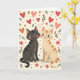 Two cute cats, one dark and one light-colored sit happily beside each other surrounded by hearts and flowers in a retro design.