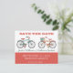 Here's an adorable, sweet Save the Date announcement invitation for your upcoming nuptials! Tell friends and family the future wedding date in advance so they can make arrangements to attend. A pair of old school style bikes in retro vintage colours of teal blue green and orange with matching colours and retro cool fonts. Personalise it with your names, date, and the location of your marriage ceremony. Off white/cream coloured background front and back. Bicycle graphics are by Rhoda Design Studio on etsy.com