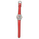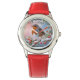A cute and stylish watch for the festive season, featuring an illustration of a European robin redbreast bird in the snow. The traditional robin is pictured in a watercolor style, on a branch with red berries and a sunset glow in the background. An ideal gift for a child at Christmas.