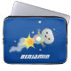 This cute robot is flying in space with rocket power! Drawn in adorable cartoon illustration style.