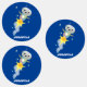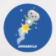 This cute robot is flying in space with rocket power! Drawn in adorable cartoon illustration style.
