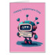 Cute Happy Valentine's Day card featuring a blue, pink robot with blue hearts holding a sign with the text 'Processing affection protocol. Result: I Like You'. Original design by Inge Lewis and AI. This heartwarming and fun card will certainly bring lots of smiles to anyone. Browse for more matching products at the ingeinc.com shop / boutique.