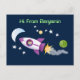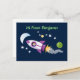 Cute rocket ship in space cartoon illustration postcard
