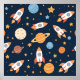 Blast off into imagination with this delightful outer space adventure! Playful cartoon rockets in orange and white zoom past colorful planets like striped Saturn, cratered moons, and swirling blue worlds while smiling stars twinkle on a deep navy background. The whimsical, child-friendly illustrations in vibrant yet soft tones create a fun, exploratory mood perfect for little astronauts and dreamers.
