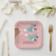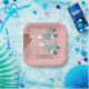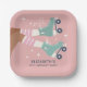 Cute blush pink roller skating birthday party napkins with a retro-inspired illustration of teal blue roller skates on a dark skin girl wearing pink-striped socks and "Let's Roll" in a fun 70's style script.
