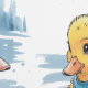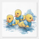 Watercolor yellow rubber duck in blue clothing in a water puddle. Great for the baby nursery!
