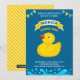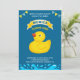 Invite your guests with this cute birthday party invitation featuring an adorable rubber duck with vibrant elements against a blue background. Simply add your event details on this easy-to-use template to make it a one-of-a-kind invitation. Flip the card over to reveal a yellow and white stripes pattern on the back of the card.