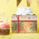 This Warmest Wishes holiday Christmas wrapping paper features a cute RV Camper at the beach. It is decorated with lights, a wreath and two pink Santa flamingo yard decorations. The camper is surrounded by palm trees with festive holiday lights and in the background the sun is setting (or rising) over the water. -