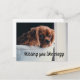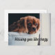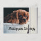 Postcard with the photo of an adorable puppy looking very sad and lonely. Text says, "Missing you like crazy."