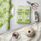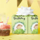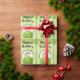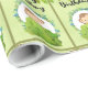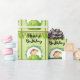 Wrapping paper with an adorable repeating pattern. A cartoon illustration of a little monkey peeking out from behind a green bush inside an olive green square. Surrounded by a wreath of tropical leaves. A banner of tropical leaves also stretches across the top of each square. Happy Birthday written in a trendy font. Set on an olive green watercolor background.