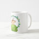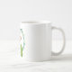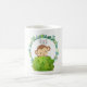 A mug with a cartoon illustration of a little monkey peeking out from behind a green bush saying hello. Surrounded by a wreath of tropical leaves. The "Hello" text can also be personalised with a name or other text if you like.