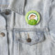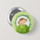 Button with a cartoon illustration of a little monkey peeking out from behind a green bush. Surrounded by a wreath of tropical leaves. Set on an olive green watercolor background.