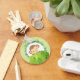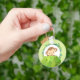 Keychain with a cartoon illustration of a little monkey peeking out from behind a green bush. Surrounded by a wreath of tropical leaves. Set on an olive green watercolor background.