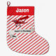 Design features a cute Santa as a Pilot flying a red aeroplane carrying a name banner. The stocking has simple red stripes and a customisable option to add the child's name to the top of the boot and the banner on the aeroplane. This would be perfect for that little aviator!