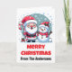 A cute whimsical Christmas illustration featuring a jolly Santa wearing his traditional red and white suit and hat, sporting a big white beard and a red nose. He is holding a big red and white striped candy cane and is standing next to a happy snowman. The snowman is also wearing a red and white Santa hat with holly leaves and berries on the brim and a red scarf around his neck. He has coal for eyes and buttons, a carrot nose and sticks for arms. He has a happy smile and rosy cheeks. Below are two templates, one to add your seasonal message and the other to add your name.
