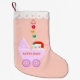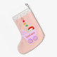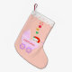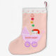 Personalised cute Santa baby on pink background Small Christmas stocking. Baby on a pink baby stroller and Christmas balls in red, green and golden colours. Santa Baby name can be personalised.