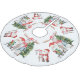 Cute Christmas Tree Skirt with whimsical santa and helpers theme. Watercolor design with santa, reindeer moose, gnome, christmas tree decorated with string lights and sleigh with gifts.