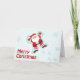 This Christmas Holiday folded greeting card has an image of Santa Clause making a snow angel with Merry Christmas written on the bottom left. In the background, there is lots of blue snowflakes.