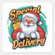 Cute Santa Claus with a gold present and green, round, sublimation background with "Special Delivery" yellow gold and black border typography.