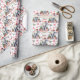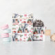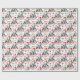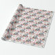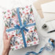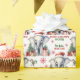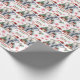The repeated pattern on this Christmas wrapping paper is of a cute grey elephant who wears a red and white Santa hat. The elephant stands in the midst of pine trees and brightly wrapped Holiday gifts. Red and green text says MERRY CHRISTMAS", with your child's name and your signature below. Other images included in the pattern include red decorative snowflakes and candy canes.