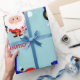 Santa and a reindeer stand by a farm tractor on this snowy Christmas wrapping paper. The message and name are easily personalised.