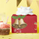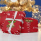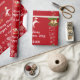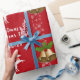 Modern, elegant, and cute Christmas wrapping paper, with an image of a unicorn pulling Santa's sleigh (full of gifts), the text "Merry Christmas & Happy New Year 20XX" in stylish script / calligraphy handwriting, and a personalised name. With sprinkles of white and silver snowflakes, and a pair of Xmas bells with a sprig of holly, on a Xmas red background.