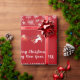 Modern, elegant, and cute Christmas wrapping paper, with an image of a unicorn pulling Santa's sleigh (full of gifts), the text "Merry Christmas & Happy New Year 20XX" in stylish script / calligraphy handwriting, and a personalised name. With sprinkles of white and silver snowflakes, and a pair of Xmas bells with a sprig of holly, on a Xmas red background.