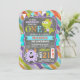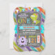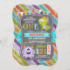 Cute and scary little monsters on chalkboard background with colourful grunge stripe back design birthday invitation card.