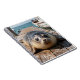 An adorable personalized notebook featuring a cute seal sitting on a boat dock by the ocean just look sweet as can be.