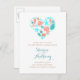 White beach wedding save the date postcard with hand drawn seashells, sand dollars, corals, starfish, seahorse, tropical fish...