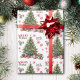 The repeated pattern on this Christmas wrapping paper includes an image of an adorable Shih Tzu puppy looking out from a wicker basket. The basket is decorated with a bright red bow, and sits beside a Holiday tree. Stylised red and green text says MERRY CHRISTMAS", and your own signature is in two fields for you to customise. Other images included in the pattern include red decorative snowflakes, candy canes, and a peppermint lolly pop.