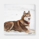 Cute Brown and White Siberian Husky portrait with incredible blue eyes on snow.