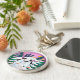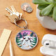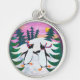 A fun Round Premium Keychain, with two cute Penguins having fun, ice-skating, in a snowy landscape with fir trees and a setting sun; from a hand-painted paper collage by Judy Adamson.