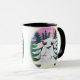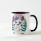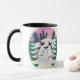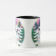 A fun Ringer Mug with a Black Lip and Handle and two cute Penguins having fun, ice-skating, in a snowy landscape with fir trees and a setting sun; from a hand-painted paper collage by Judy Adamson.