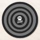 Monochromatic graphic art design of a cute skull and crossbones with black and grey circles.