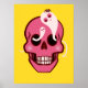 Cute skull poster with a cartoon illustration of a funny pink skull with rosy cheekbones and two cute ghosts in its eye sockets watching each other and smiling, little adorable spider standing on top of one of these spooky friends. This fun macabre design has bright psychedelic, trippy pink and yellow colors.