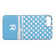 Custom iPhone 7 case done in pretty sky blue, with white polka dots, on the top half of the case. Graphics of a white ribbon decorates the middle of the case and a white bold one letter monogram, on the bottom, is ready to personalise.