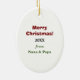 Here is an adorable personalised Christmas ornament for a young child. The front features a cute baby penguin cartoon image. The penguin is wearing a maroon and pink Santa hat and scarf. It is standing on a sled, while a few silver snowflakes drift down around it. Above the image is a white scroll banner lined in red with your custom text in black. The back of the ornament has three additional text fields for you to customise. A perfect Holiday keepsake for any child.