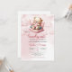 Cute design for girl Baby Shower invitations features Watercolor dusty pink and ivory sleeping teddy bear. Modern playful calligraphy font lettering with heart says "We can bearly wait for baby to arrive.