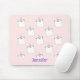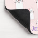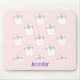 A customised mousepad with a cute pattern of sleeping kitty cats. On a pink background.