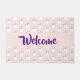 A welcome doormat a cute pattern of sleeping kitty cats. On a pink background.