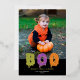 This cute Halloween photo card features one vertical photo and a cute but slimy greeting "BOO!" in orange, green, purple and gold foil on the front. On the back you will find an orange background (which can be changed if desired). Further customise this design by adding a photo and/or text to the back! The gold foil on this card really shines and adds that extra special touch to your Halloween cards. Foil is available in gold, silver, and rose gold. See the collection for more items!