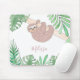 This cute mouse pad is decorated with a rose gold glitter smiling sloth hanging from a branch surrounded by green watercolor jungle leaves.