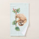 Towels with an adorable sloth hanging upside down from a tree branch. Tree branch is decorated with tropical leaves and berries.