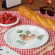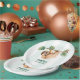 Birthday paper plates with an adorable sloth hanging upside down from a tree branch. Tree branch is decorated with tropical leaves and berries.