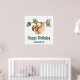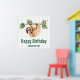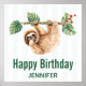 A birthday poster with an adorable sloth hanging upside down from a tree branch. Tree branch is decorated with tropical leaves and berries.