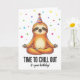 Send relaxing birthday wishes with this adorable card featuring a cute sloth meditating in a lotus pose, wearing a colorful party hat! The text reads, "TIME TO CHILL OUT it's your birthday!" Perfect for anyone who loves sloths, yoga, or just needs to take it slow on their special day.