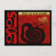 In a square are one black Snake paper-cut, placed in the centre looking at a golden ornament inside of which is the second snake with ideogram. Behind the scene there is a red background on which decorative and ornate letters form the words: SNAKE YEAR. Design on horizontal holiday postcard with large red customisable 2025 on black background. You can easily change number (font, colour, size and position) by clicking the customise button. Matching holiday postcard and more... Perfect for Chinese New Year of the Snake 2025 or birthday (people born in Snake Year). --------- "The snake (蛇) is the sixth of the twelve-year cycle of animals which appear in the Chinese zodiac related to the Chinese calendar.