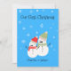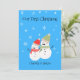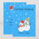 Cute Snowman Couple First Christmas Holiday Card personalised with your Names. This 2-sided card is designed with a cute Snowman Couple on the front cover, surrounded with snowflakes on a soft blue background. The front text includes: Our First Christmas and your First Names. The reverse side text includes: Your Christmas message: Wishing Your A Very Merry Christmas & A Happy New Year, with space to sign your names at the bottom, on a matching soft blue background, with two snow caps. To personalise this Christmas Holiday Card, simply insert your text into our easy template, replacing the sample. It's fast and easy!