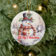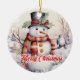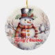 'Tis the season, cute classic snowman with a little bird in snow and red festive sparkle script "Merry Christmas" - perfect Christmas tree ceramic ornament.